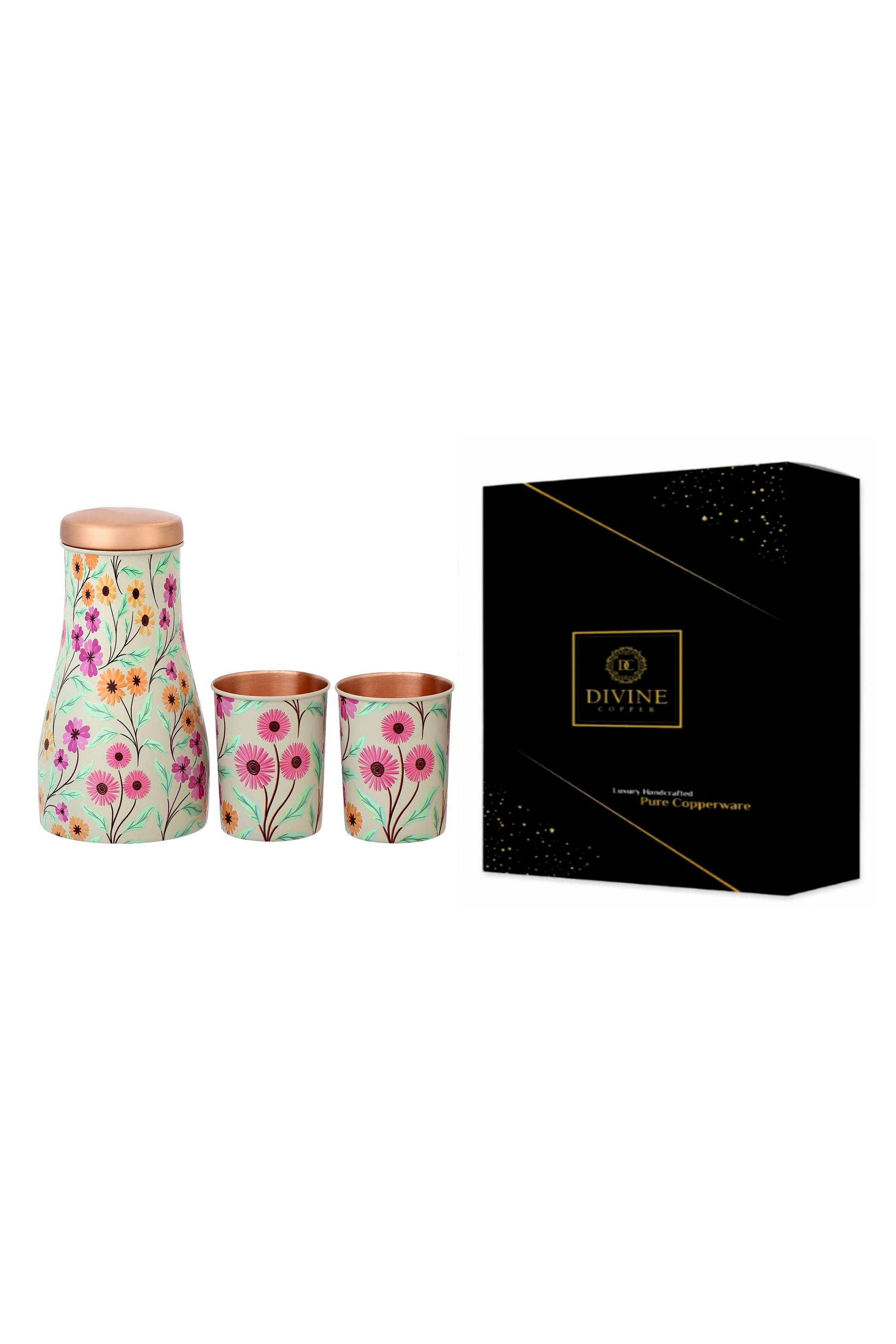Jar - Vintage Disty flower Print Pure Copper Jar With Pack of 2 Glass
