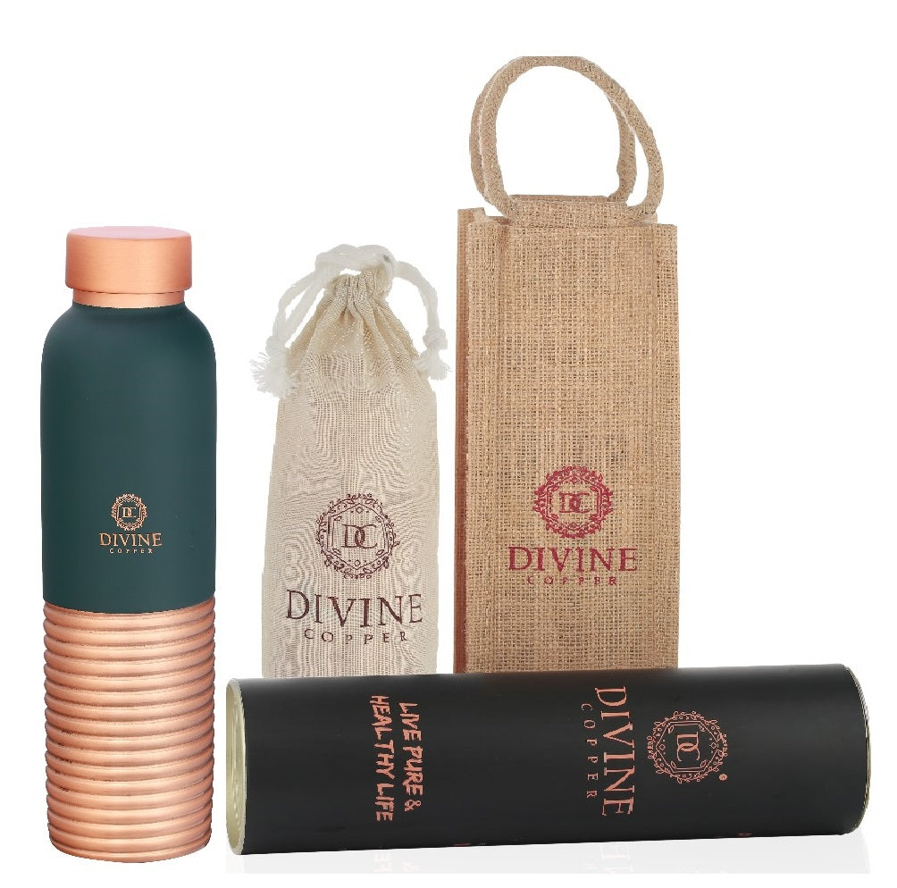 Redefine your hydration routine with the striking Oreo Multiring Green copper bottle by Divine Copper. Crafted from premium 100% pure copper, this elegant bottle features a modern dual-tone design—smooth matte green on the top and artistically carved copper rings on the bottom for a bold, contemporary look.